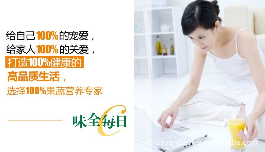 卖点:精选来自新疆的优质番茄,属于意大利里格尔87号专用品种,茄红素含量是一般番茄的3-4倍,茄红素有延缓衰老、淡化皱纹的作用。更有8种蔬菜(番茄、菠菜、芹菜、生菜、南瓜、甜菜、红甜椒、紫甘蓝)和6种水果(苹果、葡萄、菠萝、百香果、蓝莓、柠檬)均衡适量配比,富含人体一日所需的多重营养成份。