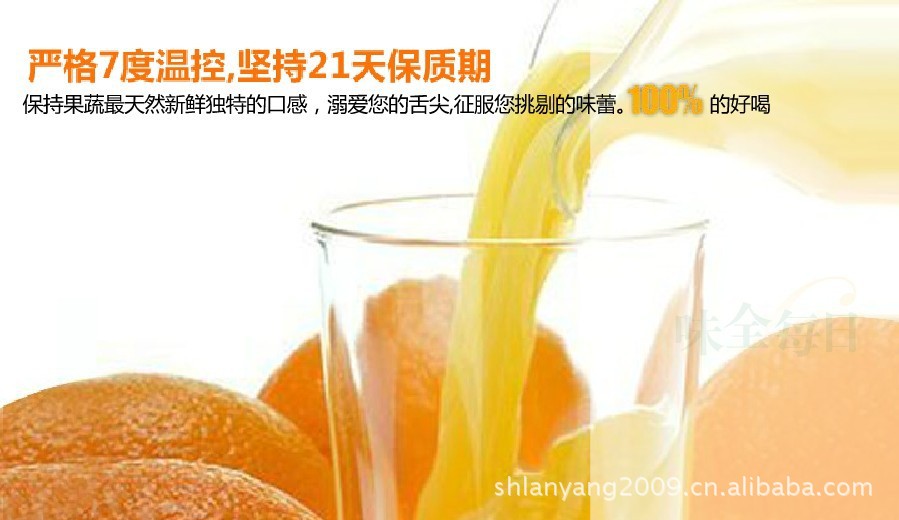 卖点:精选巴西.圣保罗的『瓦伦西亚』、『Pera』品种和以色列甜橙,得天独厚的天然环境,精细的鲜榨超滤工艺,再以低温无菌灌装;确保每滴橙汁都有鲜美的口感和丰富的果维营养;富含维生素C。